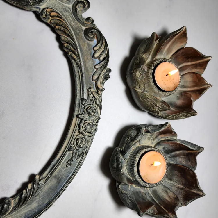 ست شمعدان طرح گل ساغر پتینه کاری شده مناسب دکوری خاص شما می باشد .