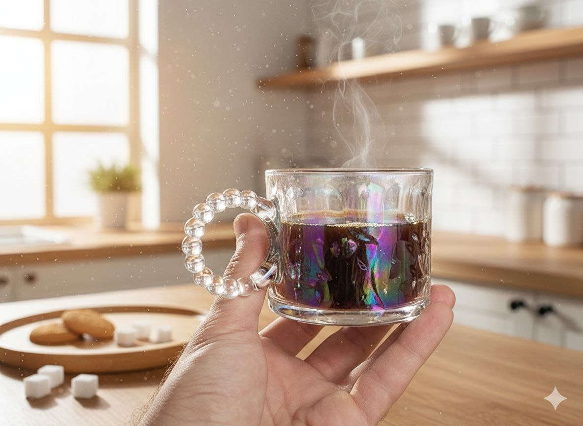 نقطهی تمایز این محصول، لعاب منحصربهفرد هولوگرامی آن است. درخشش این لیوانها زیر نور، شبیه به یک رنگینکمان سیال است که با تغییر زاویه، رنگهای بنفش، آبی، طلایی و سبز را به زیبایی منعکس میکند و نوشیدنی داخل آن را به یک منظرهی دیدنی تبدیل میسازد.